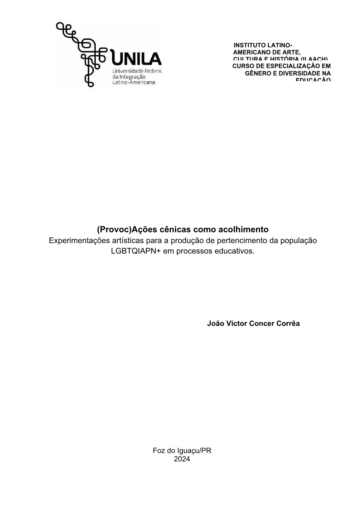 Item Mulheres e literatura: trajetórias narrativas e a arte como contribuição crítica(2024) Lyra, Juliana BorettiA literatura escrita por mulheres, ao longo da história ocidental, enfrenta problemáticas enraizadas na estrutura do sistema capitalista que marginaliza e subestima suas vozes. Através da leitura de obras de autoras latino-americanas, foram desenvolvidas oficinas com objetivo de instigar a reflexão crítica sobre as formas de opressão e marginalização das mulheres, quase sempre naturalizadas na sociedade. Essas narrativas literárias exemplificam várias violências enraizadas nas relações de dominação patriarcal e pressupõem seu reconhecimento inicial e a discussão sobre essas questões. O desenvolvimento dessas oficinas, juntamente aos estudos de gênero, possibilitam uma reflexão sobre as dinâmicas de poder e opressão, contribuindo para a construção de uma consciência crítica sobre a experiência feminina e seu papel na sociedade contemporânea, visando sua superação. O escopo teórico utilizado fundamenta-se nas obras Desesterro (2017), de Sheyla Smanioto, Garota, mulher, outras (2020), de Bernardine Evaristo, Hospício é Deus (2015), de Maura Lopes Cançado, Saboroso Cadáver (2017), de Augustina Bazterrica e Chapada da Palma Roxa (2019), de Tereza Albues.Item Tecendo a diversidade: um olhar crítico sobe as práticas das relações éticos-raciais em colégios municipais de Foz do Iguaçu/embasamento da Lei 10.639/03(2024) Lenz, Rosa Assanatú BaldéNo presente artigo abordamos a aplicação da Lei 10.639/2003, que torna obrigatório o ensino de História e Cultura Afro-Brasileira em todas as escolas brasileiras, através de um projeto de intervenção realizado no ano de 2023 na UNILA – Universidade da Integração Latino Americana, onde me formei em e Foz do Iguaçu e que teve continuidade em dois colégios municipais da cidade de Foz do Iguaçu/PR. Em sua aplicação o projeto visa ampliar a compreensão dos alunos sobre a contribuição negra e africana na formação da sociedade brasileira, combater o racismo estrutural e valorizar a diversidade cultural. A pesquisa destaca a importância de descolonizar o currículo, as práticas educacionais e os lugares de poder a partir dos estudos da Professora Nilma Lino Gomes (2008). A prática de intervenção incluiu diversos autores contemporâneos que desafiam os paradigmas eurocêntricos no modelo educacional, além de abordar temas como diversidade cultural e gênero, incorporando ao debate em sala de aula experiências vividas por mulheres negras que residem em Foz do Iguaçu/PR. As considerações finais destacam a complexidade de trabalhar com relações étnico-raciais na sala de aula e a responsabilidade dos docentes na desconstrução de ideologias racistas.Item Gênero e diversidade na educação: os saberes originários na comunidade Tekoha Ocoy(2024) Calil, Anderson SalimNosso objetivo com o trabalho, “Gênero e diversidade na educação: os saberes originários na comunidade Tekoha Ocoy”, é organizar e destacar informações que possam aprimorar a compreensão dos pesquisadores em relação à diversidade sexual e de gênero, especialmente no que tange à comunidade Avá-Guarani de São Miguel do Iguaçu: no oeste do Paraná. Desse modo, detemo-nos nas correntes teóricas que fundamentam, a questão indígena. Sobretudo, das relações em gênero e diversidade na educação.Item (Provoc)Ações cênicas como acolhimento - experimentações artísticas para a produção de pertencimento da população LGBTQIAPN+ em processos educativos.(2024) Corrêa, João Victor ConcerEste trabalho reflete sobre a condição de não pertencimento da população LGBTQIAPN+ em situações educativas, que permeia, fomenta e produz diferenças e desigualdades. A partir de pensadores da educação a pesquisa se baseia em conceitos como educação libertadora de Paulo Freire, interseccionalidade e entusiasmo de bell hooks e a valoração da diferença de Letícia Nascimento, propondo a experiência de um arte educador e educando bissexual como metodologia. A experiência é fundamentada em experimentações artísticas de programas de performance cunhado pela artista Eleonora Fabião, onde corpos e sujeitos estarão imbricados no processo educativo, vinculados pela escuta atenta de si e dos corpos presentes no processo de educação, para serem realizados como acolhimento seja na sala de aula regular, ou nas mais diversas experiências educativas. A experimentação é fundamental nos espaços educativos como forma de validar a presença de corpos flexibilizando as normas educativas provocando a cisheteronormatividade presente como herança da escola.Item Vivências de professores trans na rede municipal de ensino de foz do iguaçu - Fatores estressores e impactos na saúde mental.(2024) Garcia, Kácilla Arianne Sandoval da SilvaEste trabalho apresenta relatos de professores trans da rede municipal de ensino de Foz do Iguaçu, descrevendo vivências negativas ou traumáticas e relacionando com a maneira conservadora que a temática de gênero e sexualidade são tratadas no ambiente escolar. Através de entrevista semiestruturada realizada com dois professores trans, busca-se identificar possíveis fatores estressores nas vivências relatadas e como microagressões e discriminações podem impactar na saúde mental desses profissionais. O trabalho também identifica momentos de acolhimento e apoio na busca pela superação deste cenário conservador e preconceituoso presente na sociedade e que permeia o espaço escolar. Através desde trabalho e da análise dos relatos, é possível perceber que ambiente escolar tem reproduzido e permitido situações que reforçam a perpetuação de estigmas, o que gera impacto negativo na saúde mental desses profissionais.Item Inclusão da temática diversidade sexual na formação dos bacharéis em ciências biológicas e licenciados em ciências da natureza da 