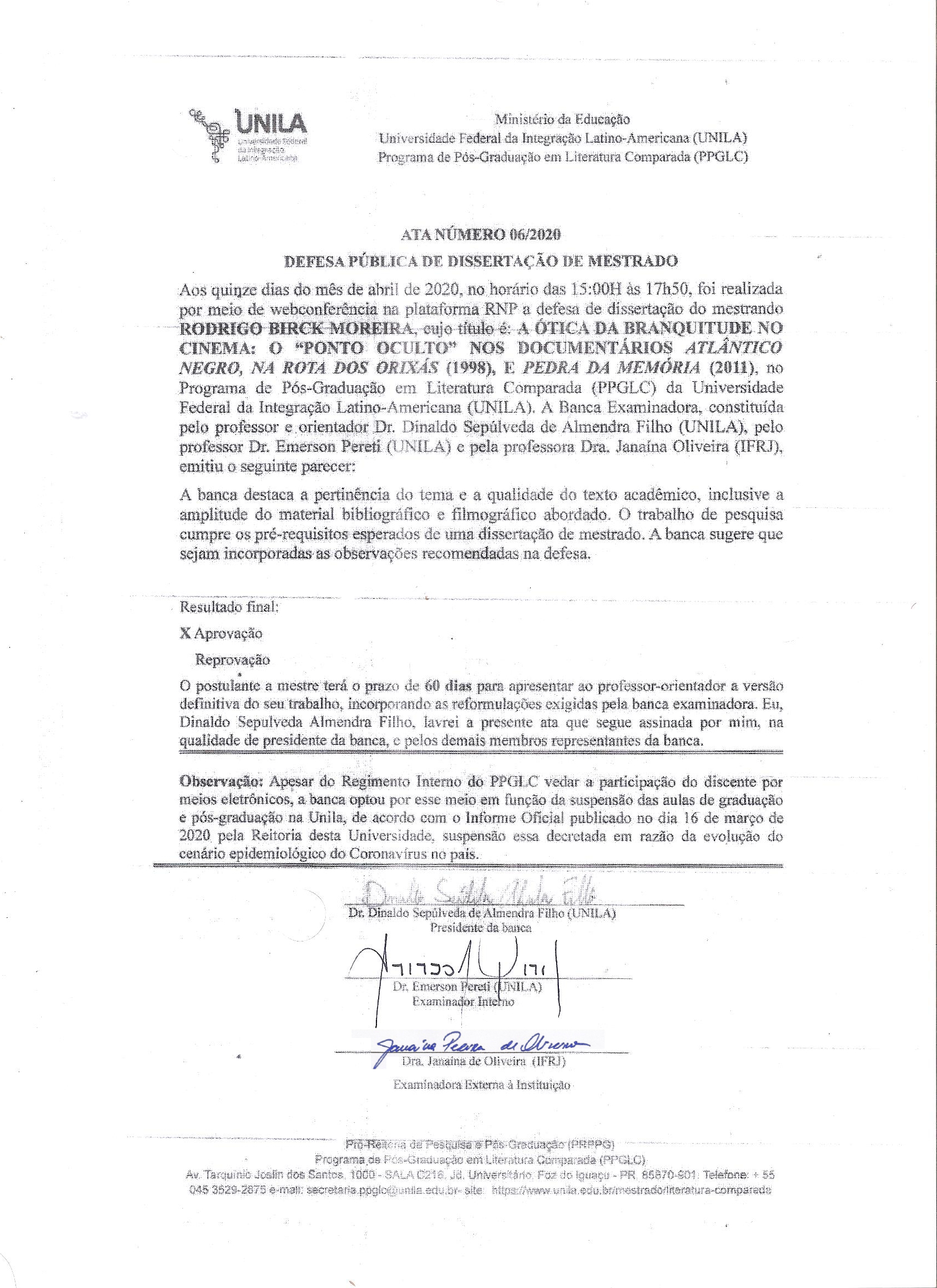 | dc.identifier.citation | MOREIRA, Rodrigo Birck. Concepção cinematográfica e identidade branca: o “ponto oculto” nos documentários Atlântico Negro, na rota dos Orixás (1997), e Pedra da Memória (2011). 2020. 228 f. Dissertação de Mestrado (Programa de Pós-Graduação em Literatura Comparada) - Universidade Federal da Integração Latino-Americana(UNILA), Foz do Iguaçu, 2020. | |